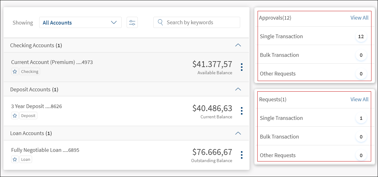 : Use the search option to look for specific requests by using the keywords such as the transaction type, - View filter: Use the View list to filter the list by single transaction or bulk transactions. By default, the All option is applied. A user who has the required permissions, can see the Features listed when applying transaction type filters on the Pending tab of Requests Dashboard.