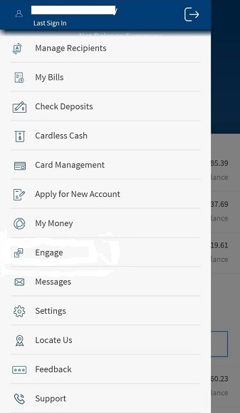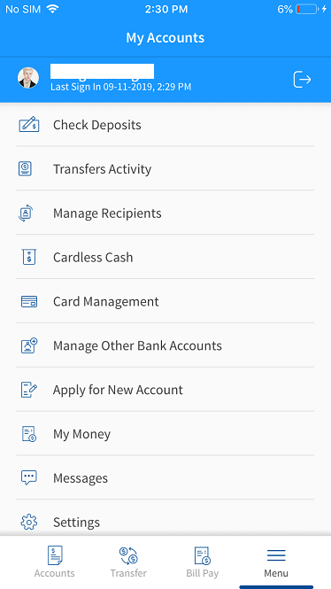 If the customer is not entitled to the Bill Pay option, then the menu contains Settings option instead of Bill Pay.