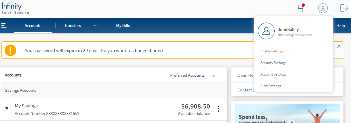 The different options available under Transfers and Pay, that is, Transfer Money, Pay Bills, Send Money and Wire Transfers are displayed based on the user's entitlements. In case the user does not have access to any of these, that option is not available here and in the corresponding menu in the navigation pane.