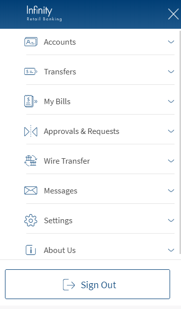 . Click to manage payees and transfers; manage bill payees and payments; send money, and manage wire transfers. - Side Menu. Click