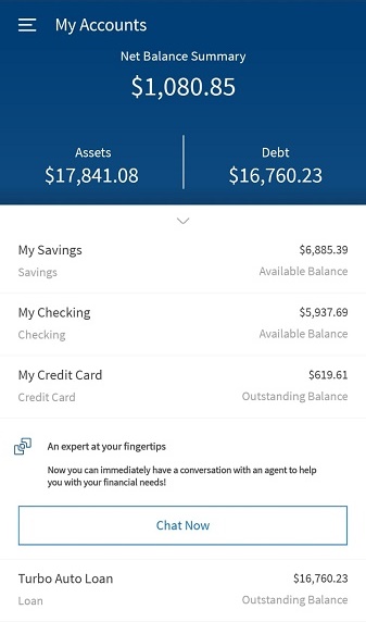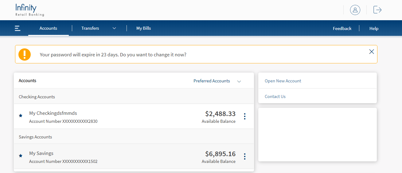 - Accounts. Click to view the account dashboard; list of your accounts with the bank; view the chart showing spending patterns in accounts, your messages, and upcoming transactions; account details and account summary; and view recent and scheduled transaction details.