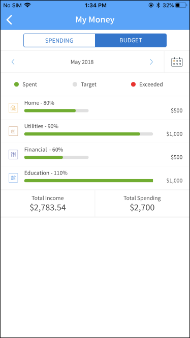 From the bottom menu, tap Menu > select My Money. The app displays My Money screen with the Spending tab selected by default. Select the budget tab to view the estimated budgets and spending made in accordance with the budget. Tap the < or > arrow to change the selected month.