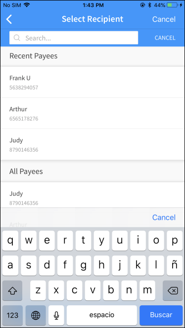 Menu path: Mobile Banking > Select Recipient > tap Search icon