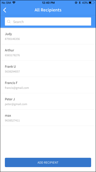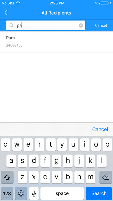 Enter the search criteria in the search field. The app displays the search results with the list of relevant P2P recipients.
