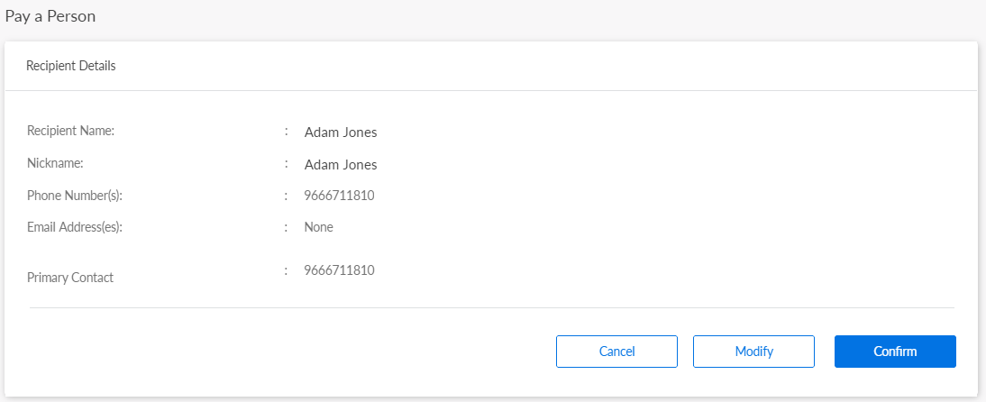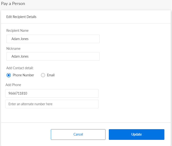 In online banking, you can modify/add the details of all the fields: Recipient Name, Nick Name, Contact Information type (Phone Numbers or Email Addresses), update the primary contact information and do the following from the acknowledgment screen: