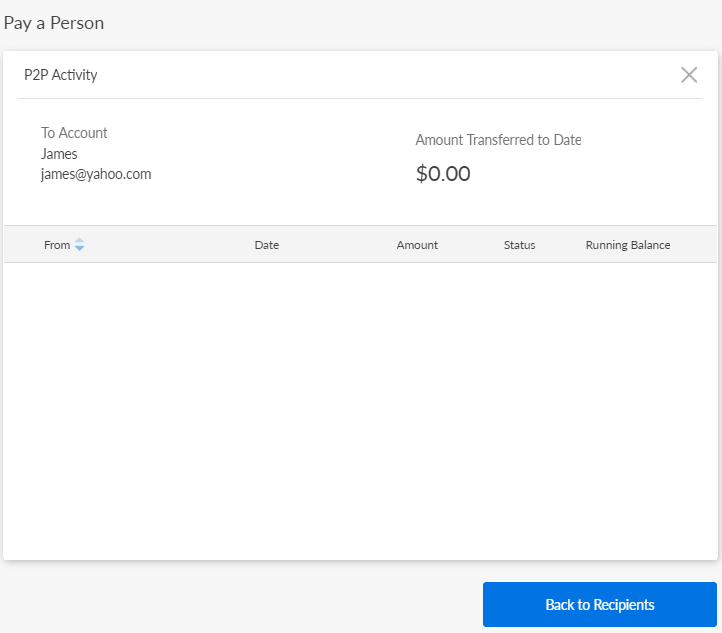 From the Manage Recipient screen, click to expand the required recipient and then click View Activity. The app displays the P2P Activity screen.