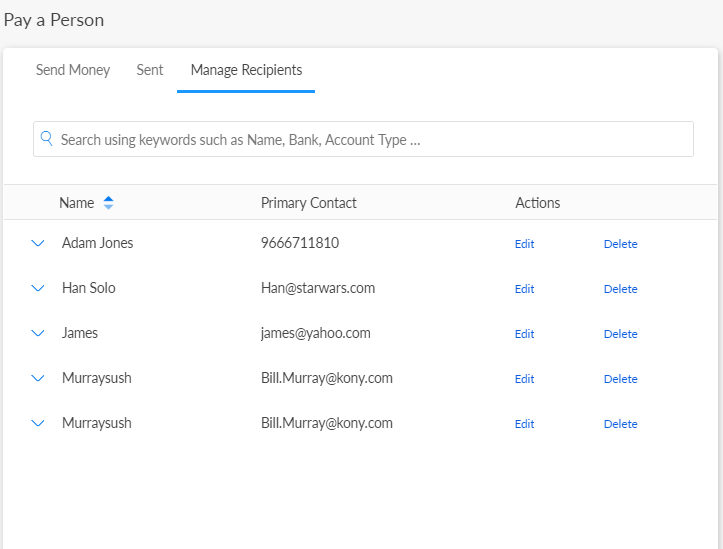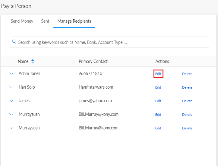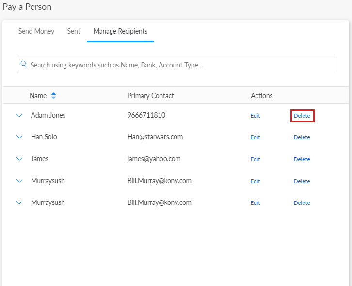 Menu path: Online Banking > Transfer & Pay > Pay a Person > Manage Recipients