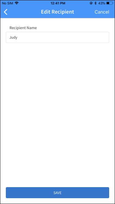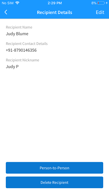 Make the necessary changes in the Edit Recipient Details screen and save the details. The app updates the details of the recipient.