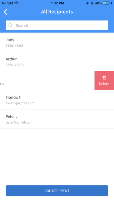 From the recipients' list, select the required recipient to delete the record. In case of mobile banking, swipe the required recipient from right to left, and delete the record. Alternatively, you can also delete a recipient on the details screen. The app removes the record from the list.