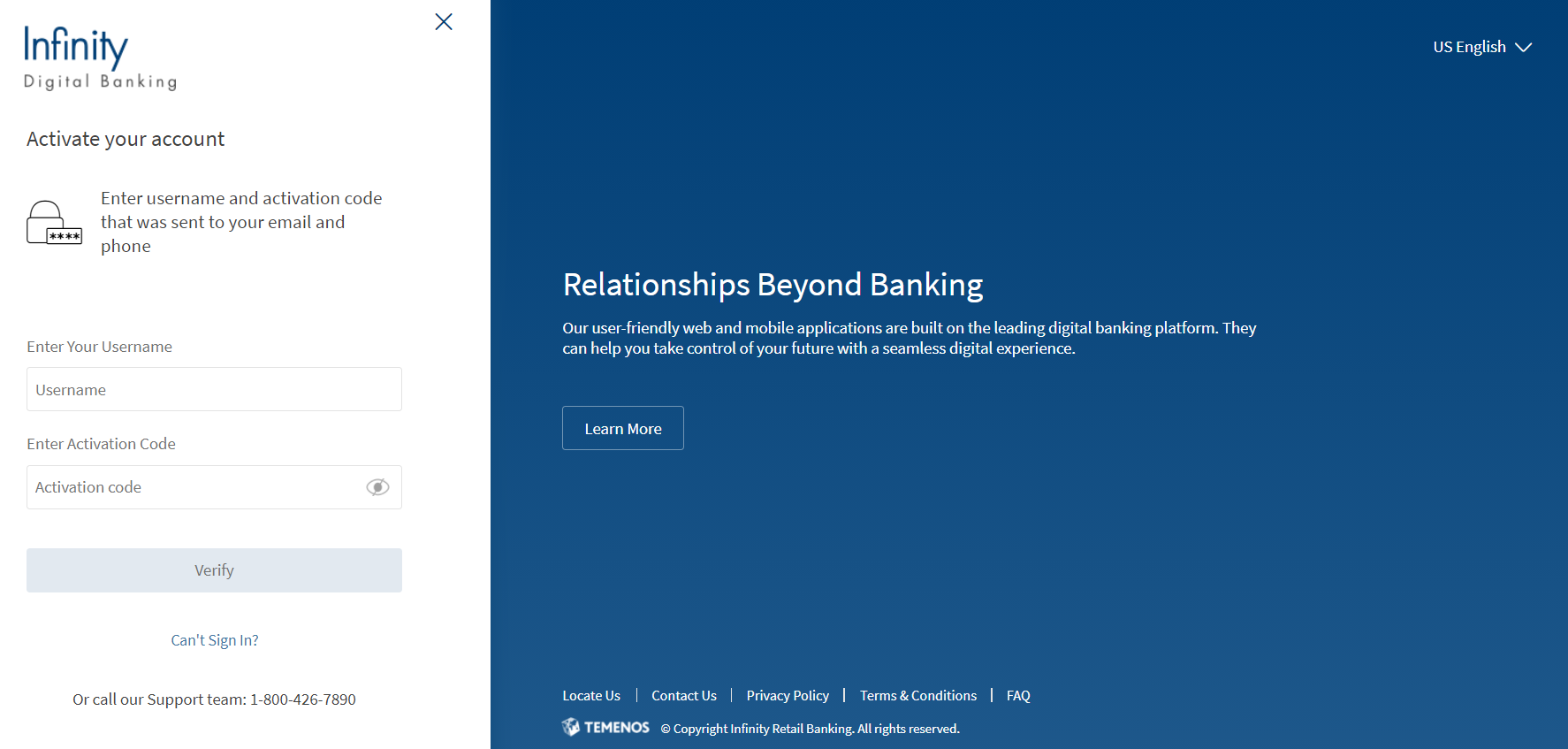 • Maximum invalid attempts to activate the digital banking profile is five. This configuration is maintained in Spotlight under System Configurations. If the invalid attempts exceeds than the allowed value an error message is displayed as "Your activation code is blocked. Please select “Can’t Sign In” to regenerate a new activation code".
