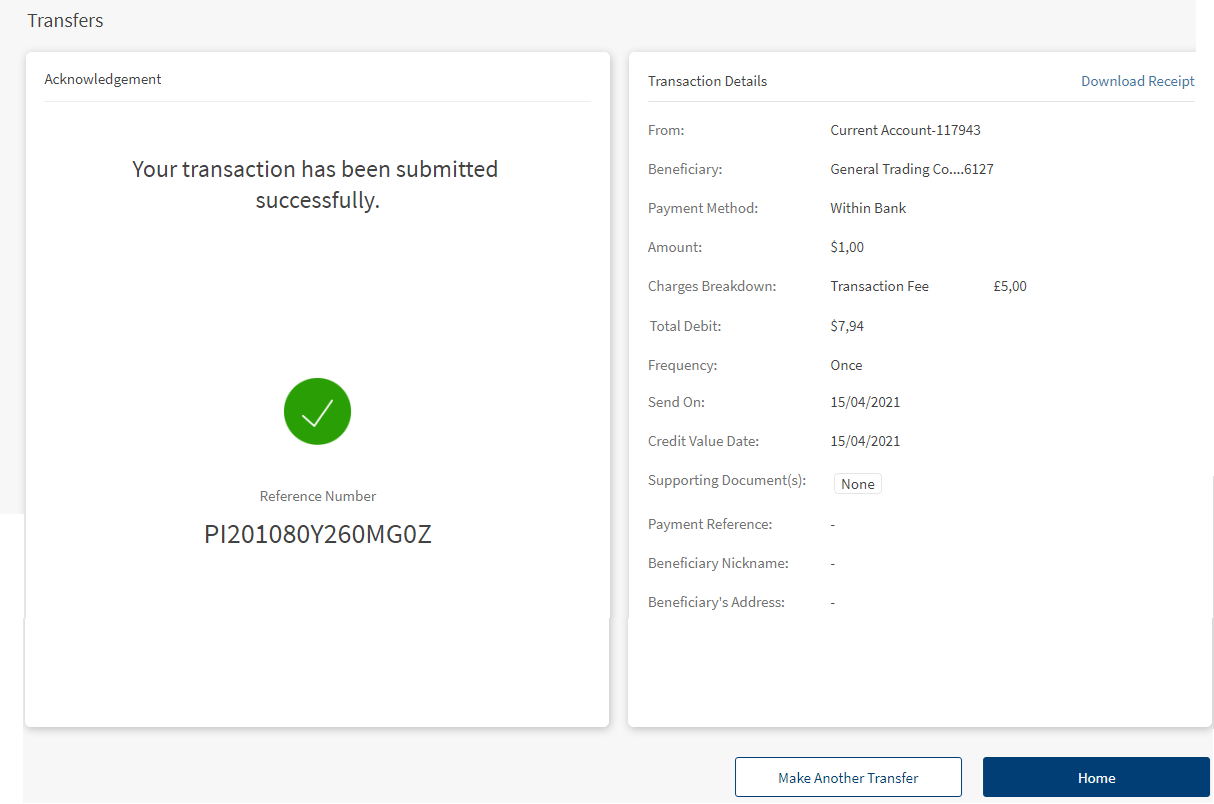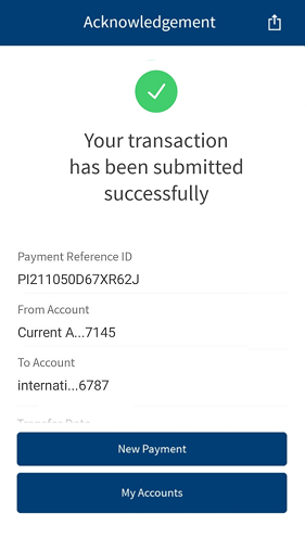 On Transfer Acknowledgment screen, the message is updated as "Your transaction has been submitted successfully". This message is displayed only in the case of the current dated, single transfer and does not apply to the below cases: