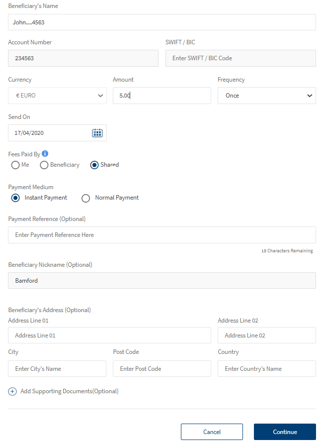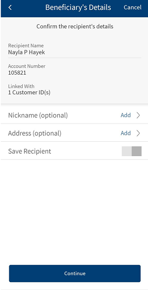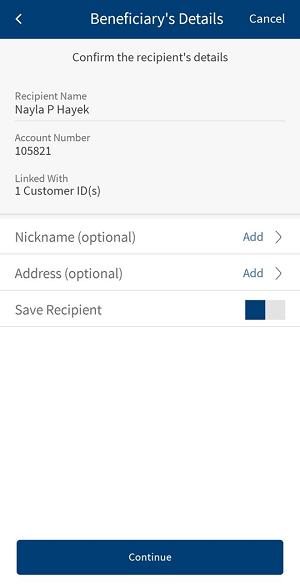 - Beneficiary Nickname. Enter the beneficiary nickname. You can enter alphanumeric characters and up to 35 characters.