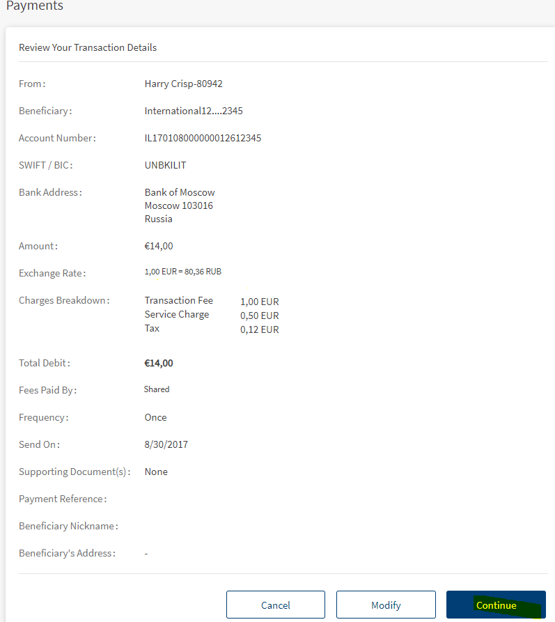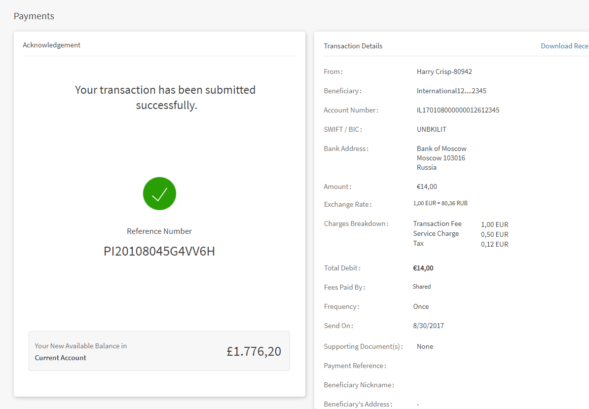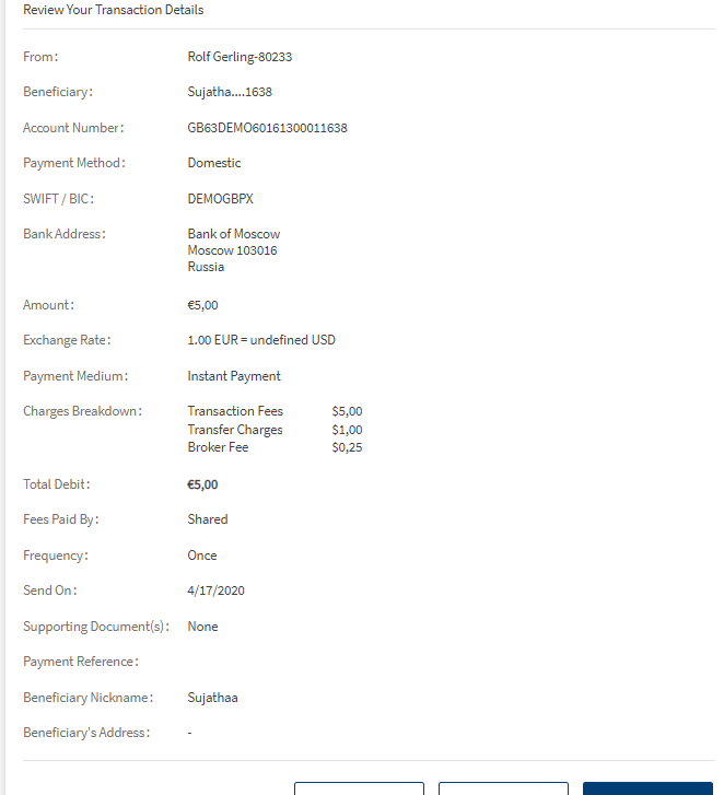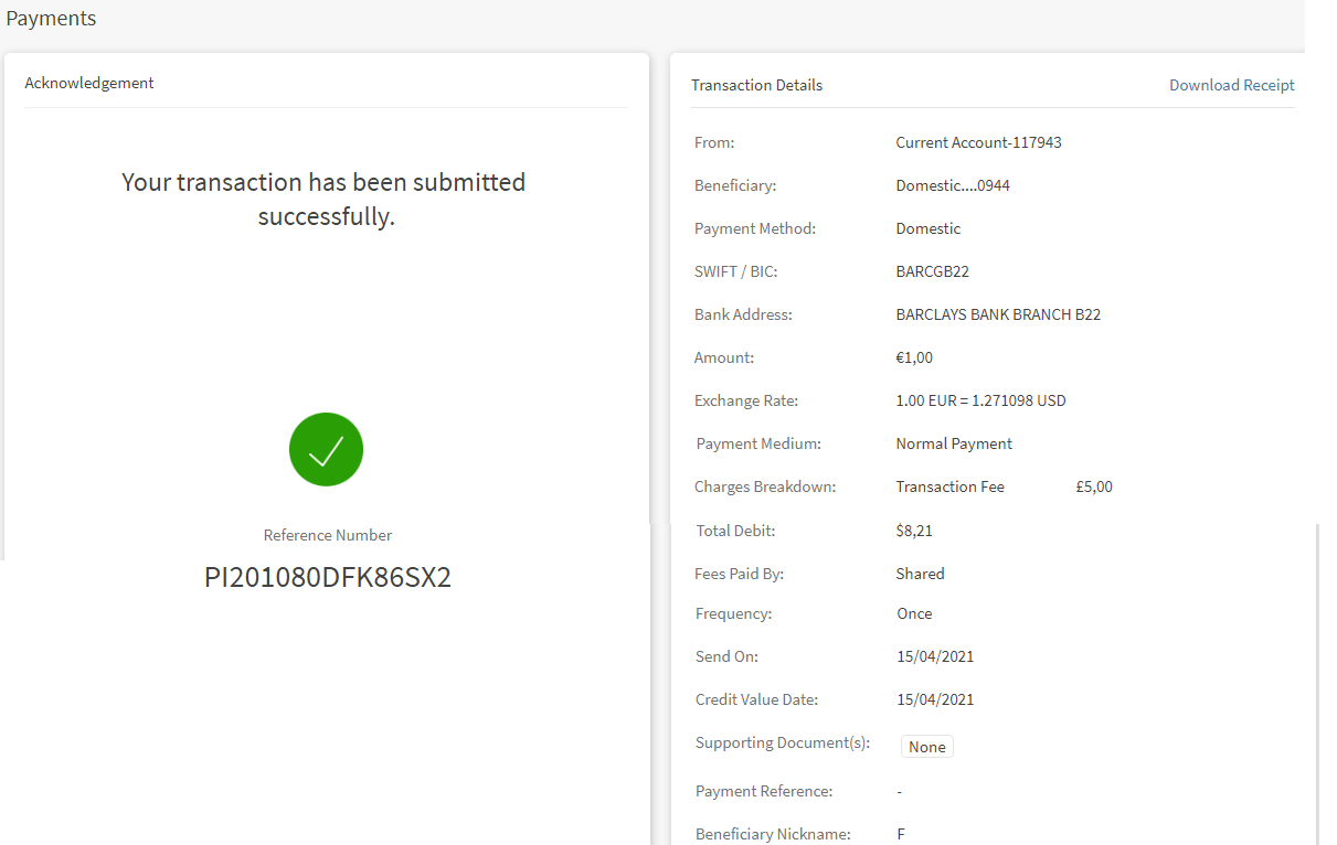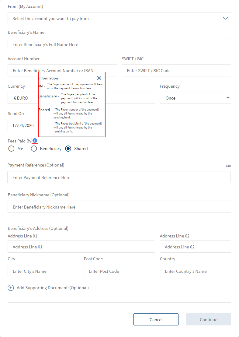 - Beneficiary - The Payee (recipient of the payment) will incur the payment transaction fees. In this scenario, the payee will receive the payment excluding the transfer charges.