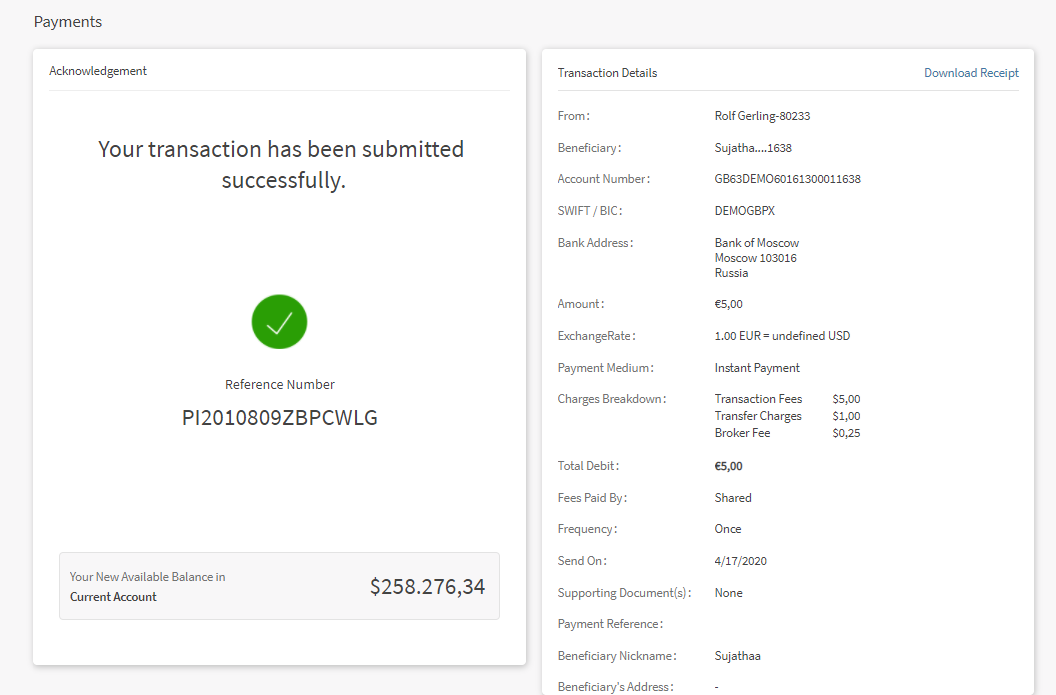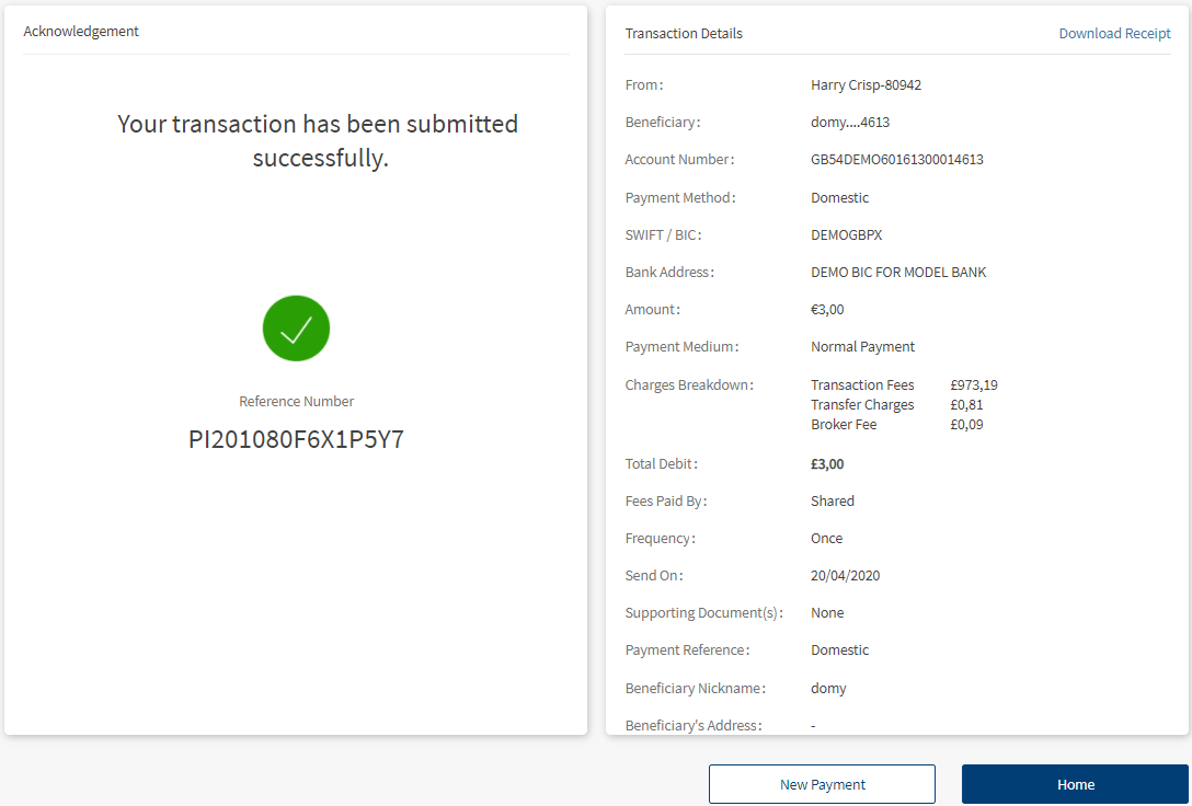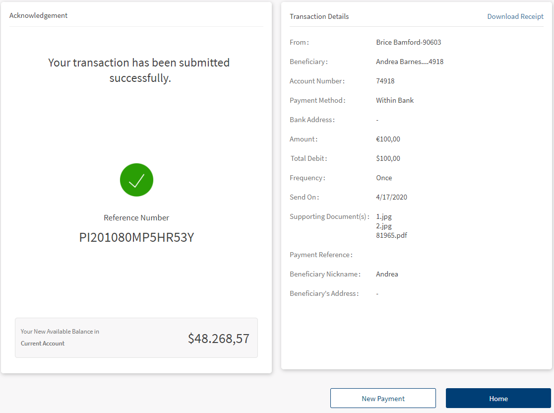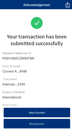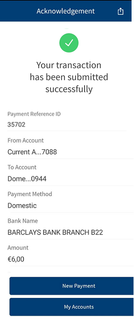 The Acknowledgment screen displays a payment unique reference ID and the payment details. You can perform the following actions in this screen: