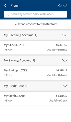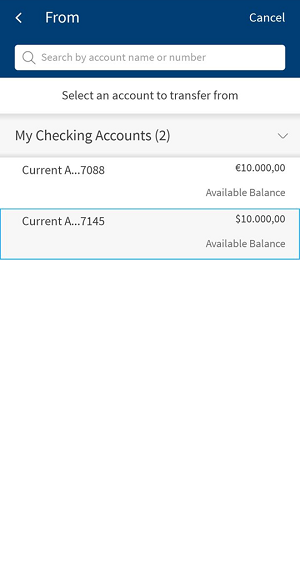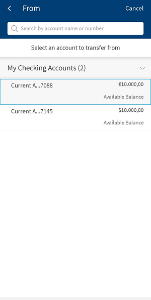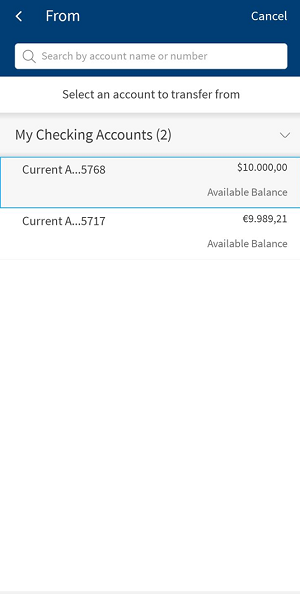 - From: You can view only the eligible Checking and Saving accounts displayed in this field. Select one of your accounts from the list. Based on the search, the respective accounts are displayed. You can search using the account name and number.