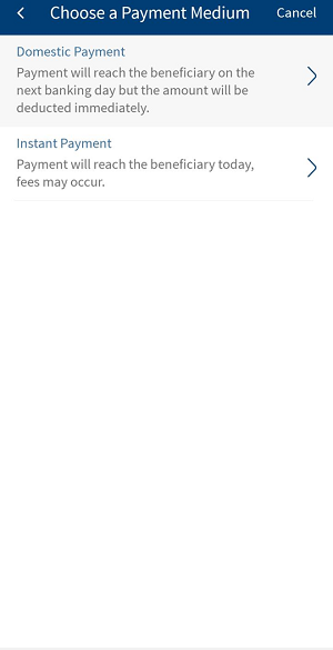 - Instant payment (Urgent payment and it incur additional charges).