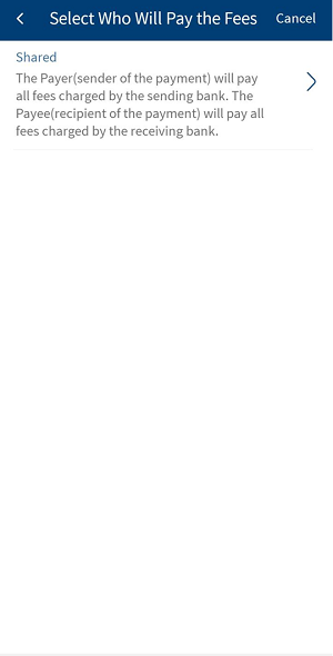 - Shared - The Payer (sender of the payment) will pay all fees charged by the sending bank. The Payee (recipient of the payment) will pay all fees charged by the receiving bank. The beneficiary will receive the payment excluding the charges.