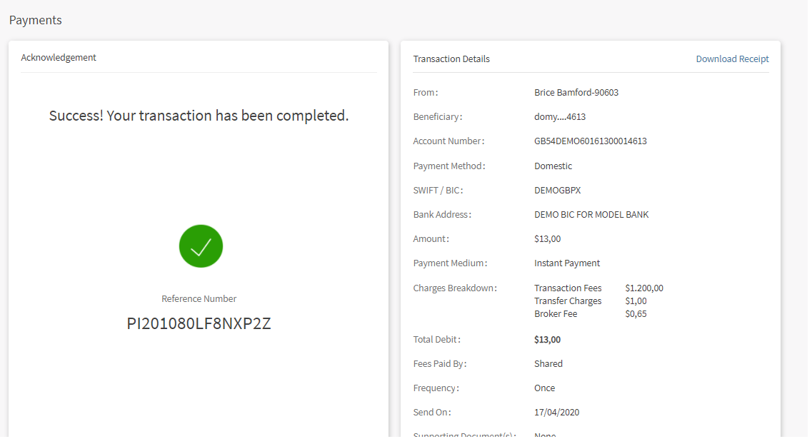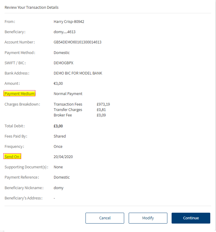 - Payment Medium. For domestic payments, you can choose between Normal payment and Instant payment. If you select,