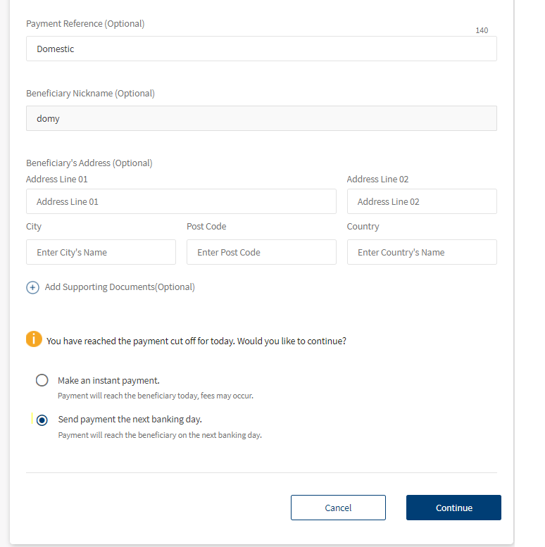 Upon clicking Continue to proceed with the payment, if the payment breaches the cut off time, a warning message is displayed with an option to send the payment on next business day.