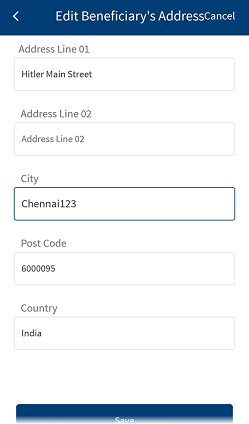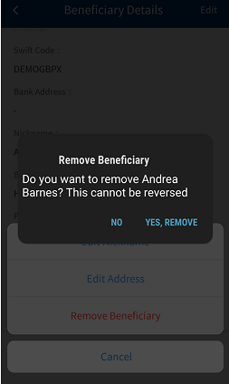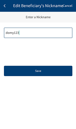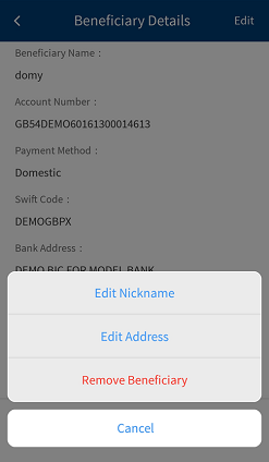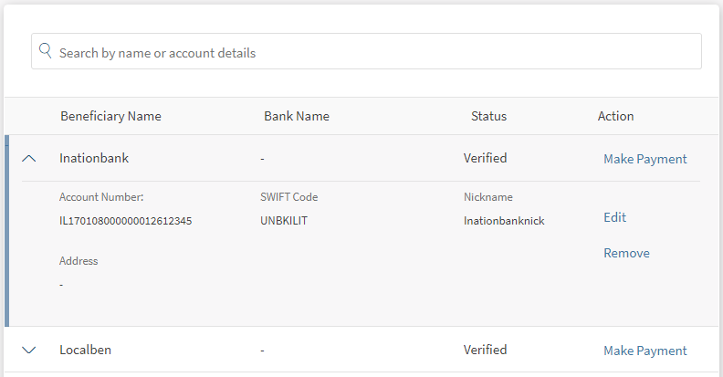- In the Make Payment screen, the beneficiary's name, account number, SWIFT/BIC, and beneficiary nick name.