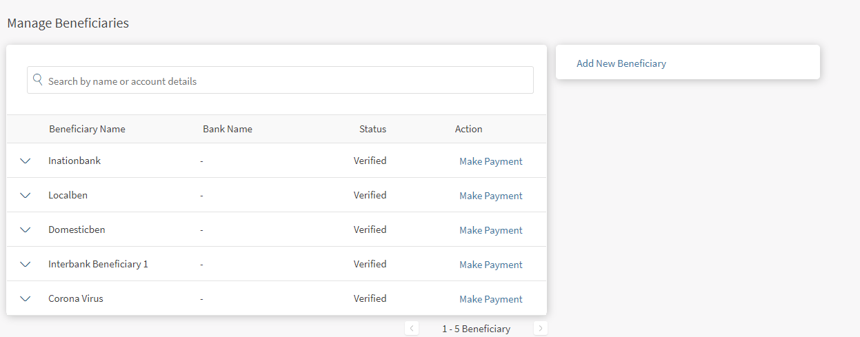 - Click Make Payment from Manage Beneficiaries screen displayed beside each beneficiary row.