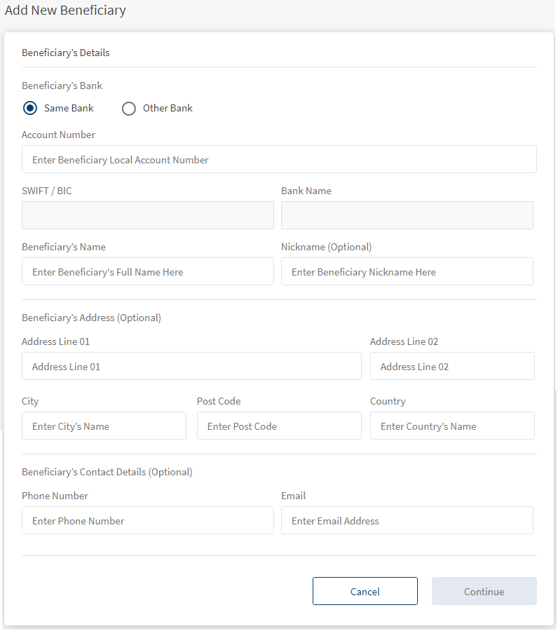 - Enter the following details to add a beneficiary: