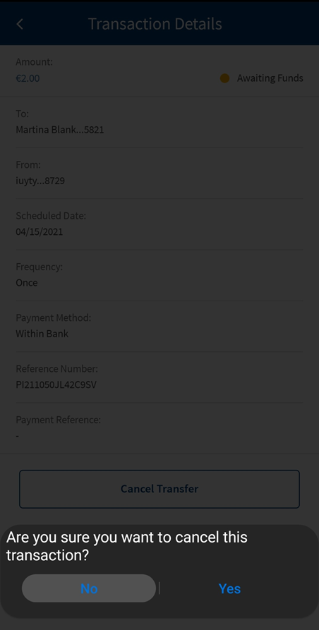 - Click Yes, the app cancels the scheduled transaction and removes the record from the recurring transactions list, else click No.