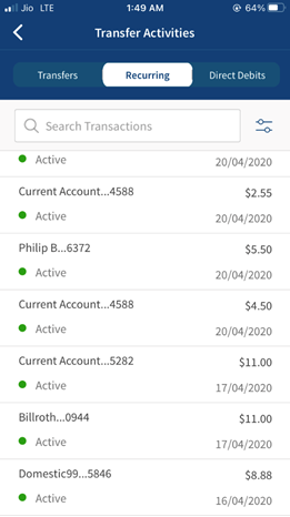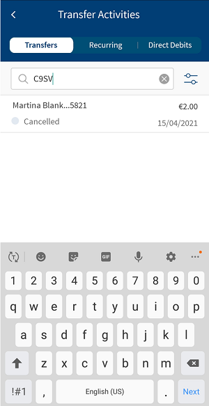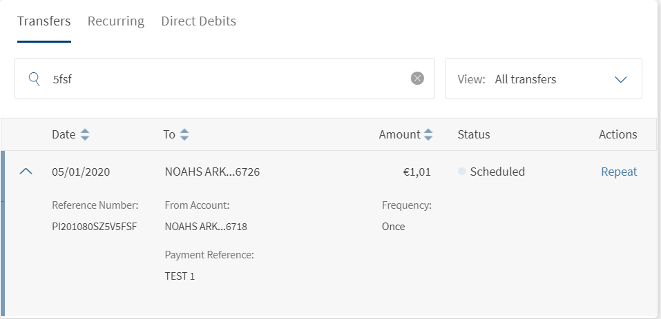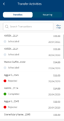 The Transfers tab displays the list of all past and future dated one-time transactions.
