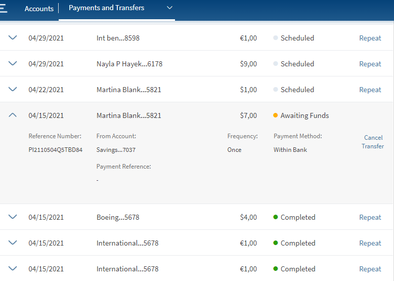 NOTE: You can also cancel a transaction that is initiated with insufficient funds. To do so, select a transaction with the status as 'Awaiting Funds'. Click the down arrow to view additional details and click Cancel Transfer. The transaction will be stopped with the status as 'Canceled'. On mobile native, you can also swipe left to cancel a transaction.