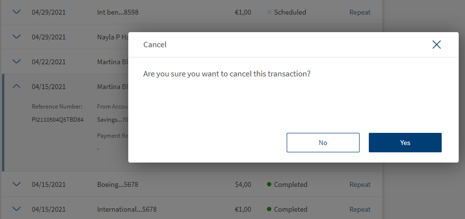 - Click Cancel to cancel the upcoming scheduled transaction. The application displays a pop-up asking for your confirmation.