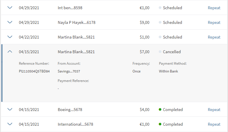 You can repeat a completed transaction from your Transfers screen.