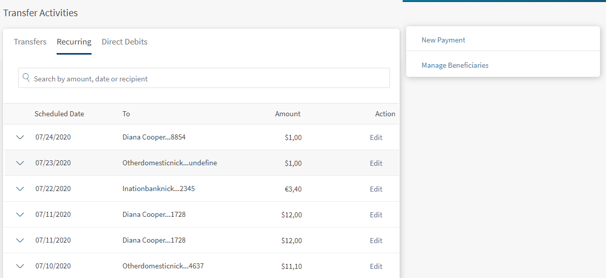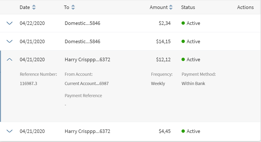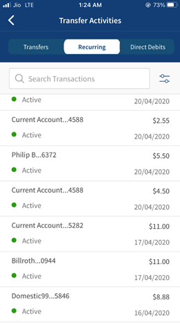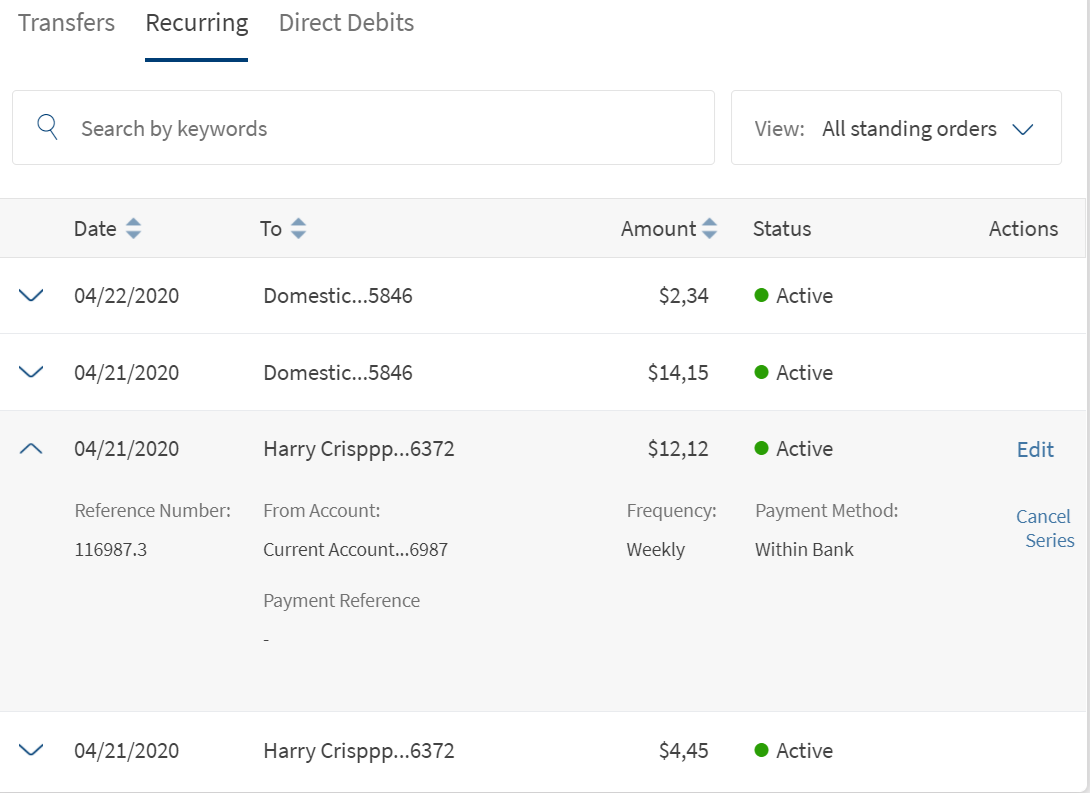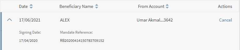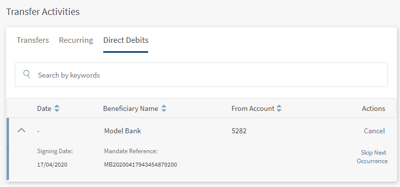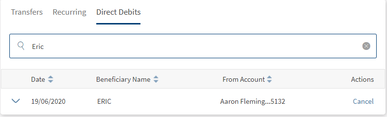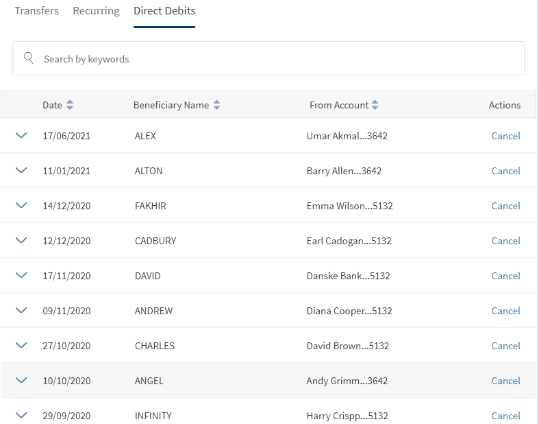 Use the feature to view all the direct debits list. All the individual direct debits for the logged in customer are displayed.