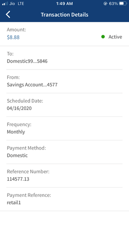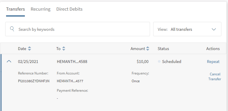 You can view the transfer details of a recurring transfer. The following details are displayed in the scheduled transaction list: