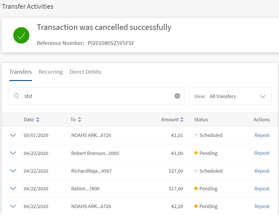 If cancel transfer/cancel series actions requires approvals, then the transaction appears in transfer activities screen with the status as Scheduled/Active.