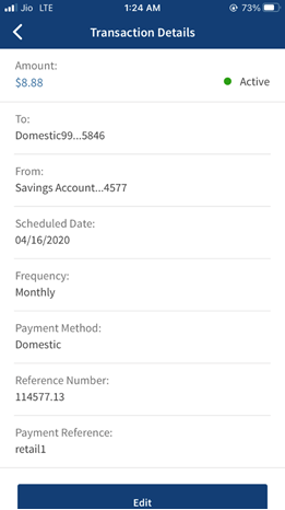 Select the required transaction and click edit to edit the details. The app navigates to the Make Payment screen. By default, the app auto-fills the same fields for the new transaction as the original transaction.