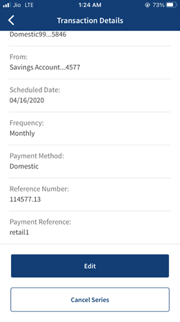 Select the required transaction from the list to cancel the transaction. If the frequency of the scheduled transaction is set to any value other than once, the app displays the following option to cancel the transaction: