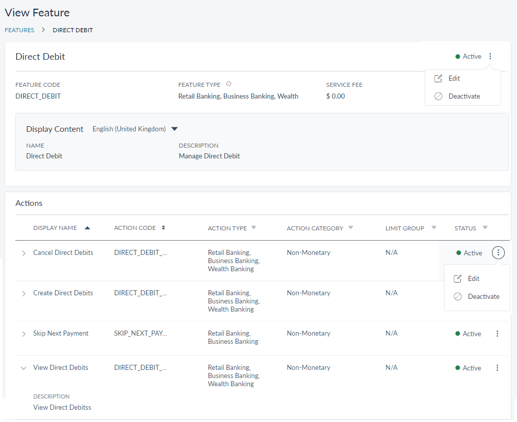 - Click the Contextual menu (three dots) on the right corner to activate/deactivate the feature. You can also edit the feature and activate/deactivate the feature.