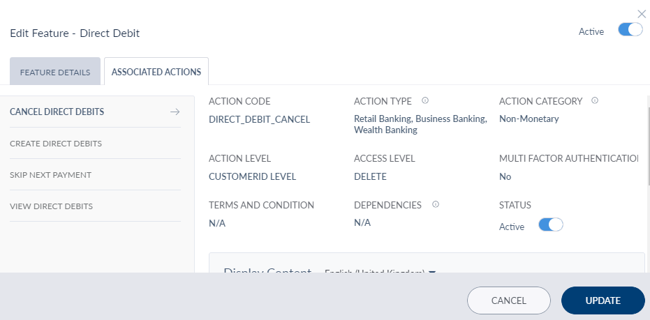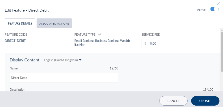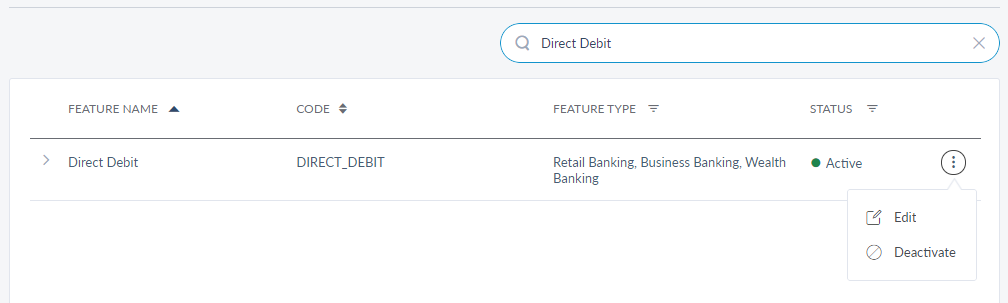 - In Master Data Management > Features > Search for Direct Debit. The direct debit feature must be active to access the feature in Retail Banking application.