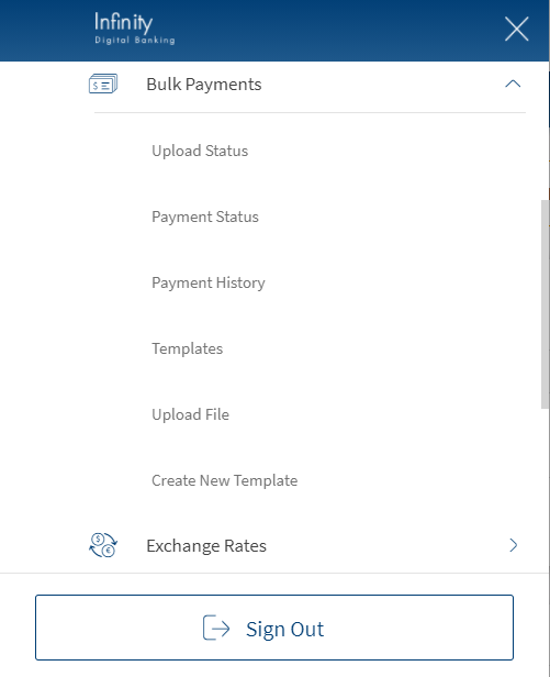 Menu path: Side menu > Bulk Payments > Click any of the following links: Upload Requests, Payment Status, Payment History, Templates, Upload File, and Create New Template. The application displays the relevant screen.