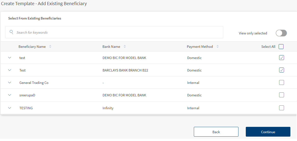 2. The select beneficiaries page appears with the list of saved beneficiaries with the following details: Beneficiary Name, Bank Name, and Payment Method.