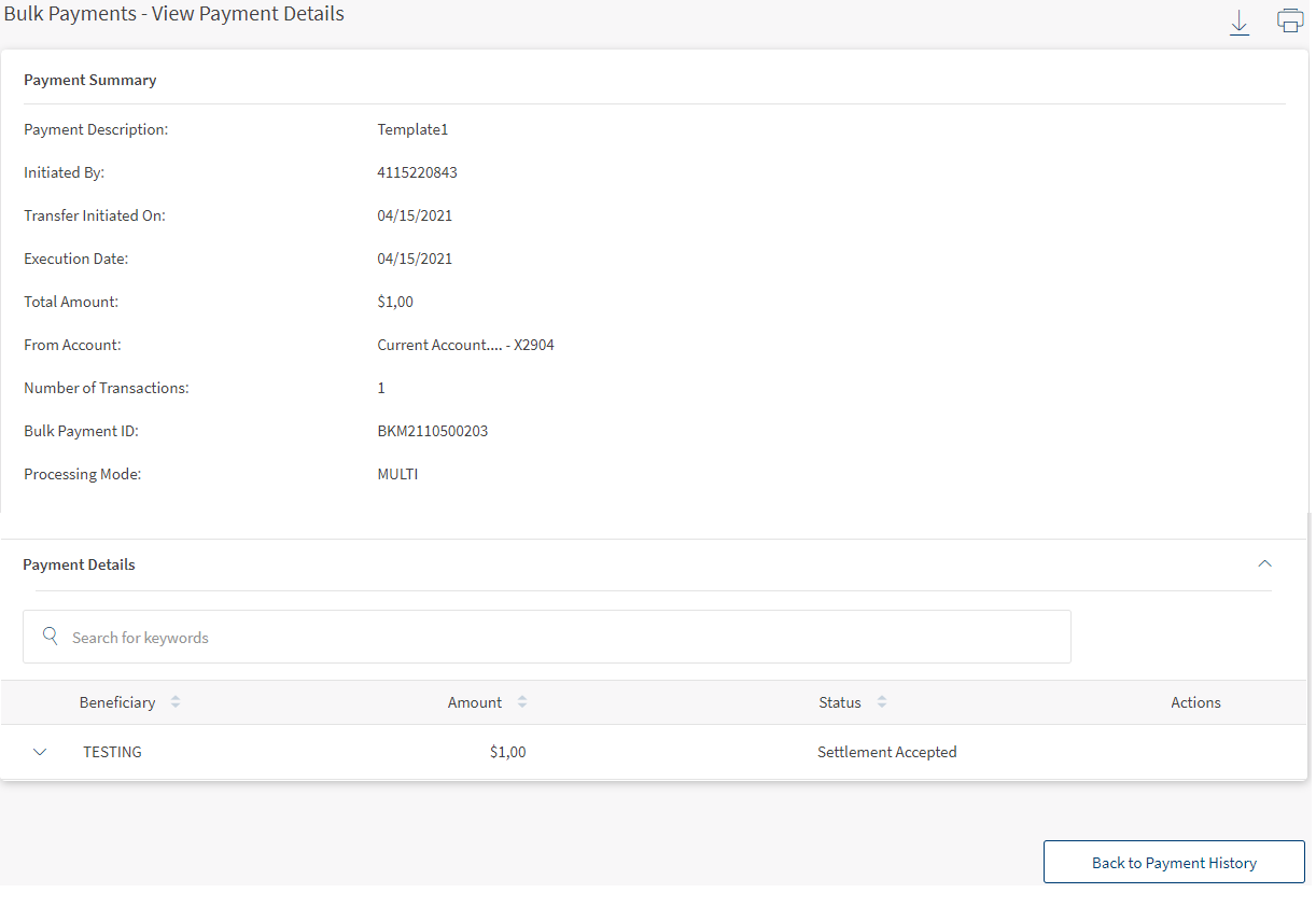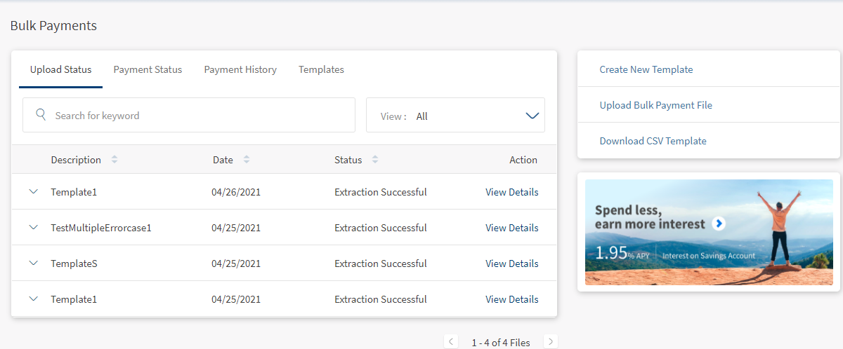 Use the feature to execute a bulk payment request using an already created template so that multiple payment details are uploaded by the user and the payments are initiated in a single instance.