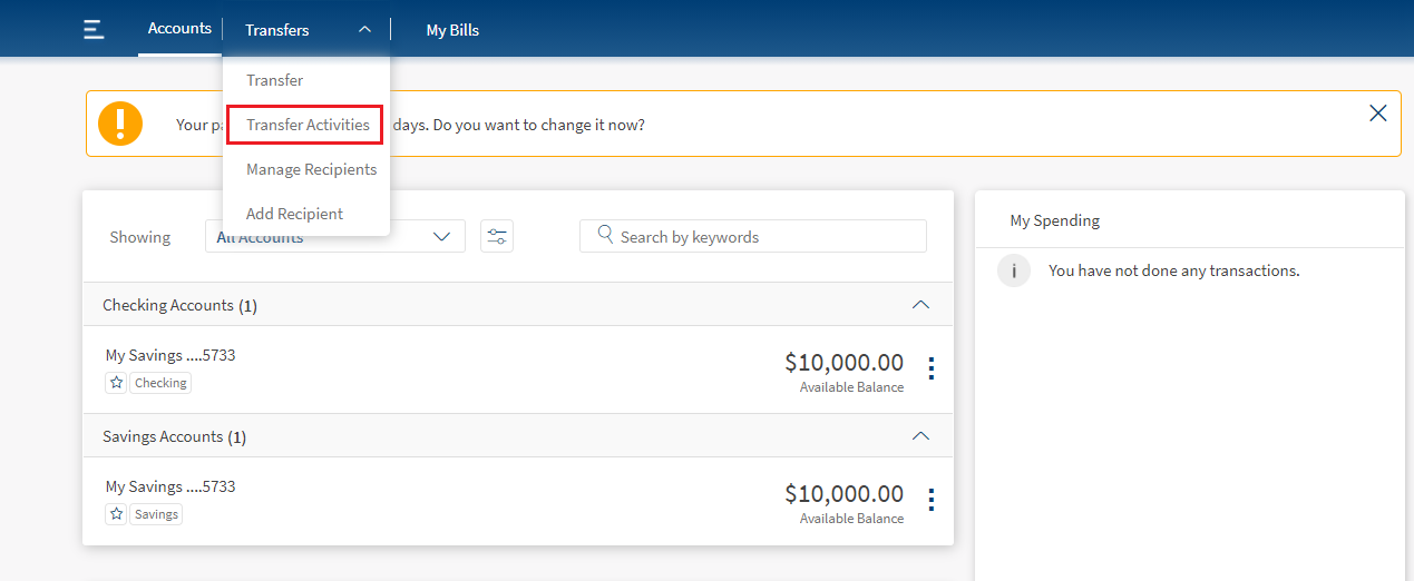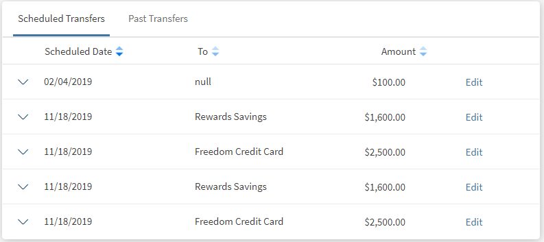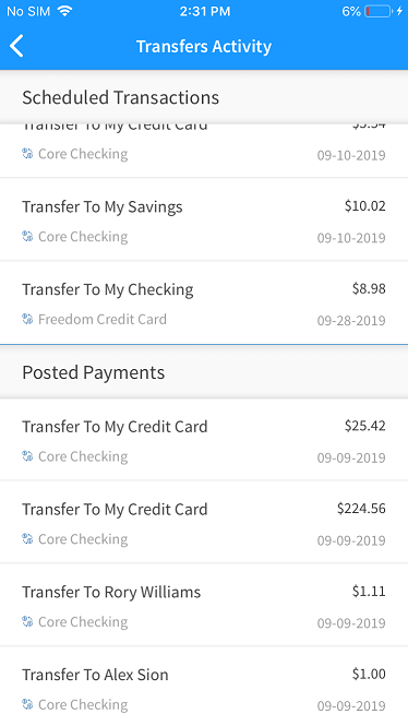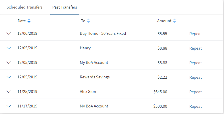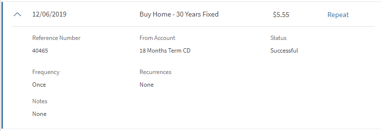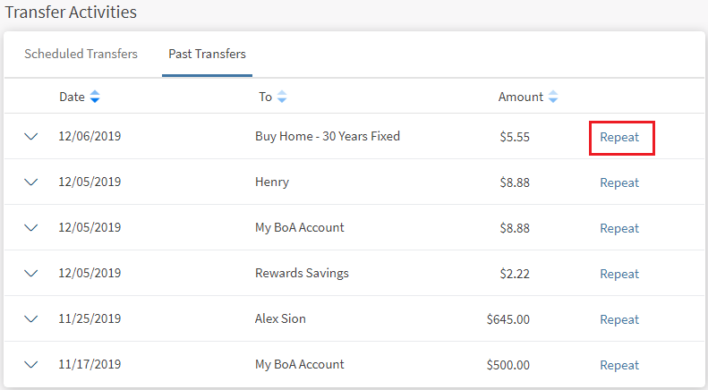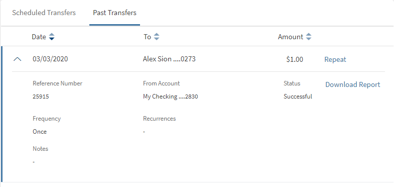 For mobile banking, tap a transaction under Past Transfers and tap Repeat Transaction to recreate the same transaction.