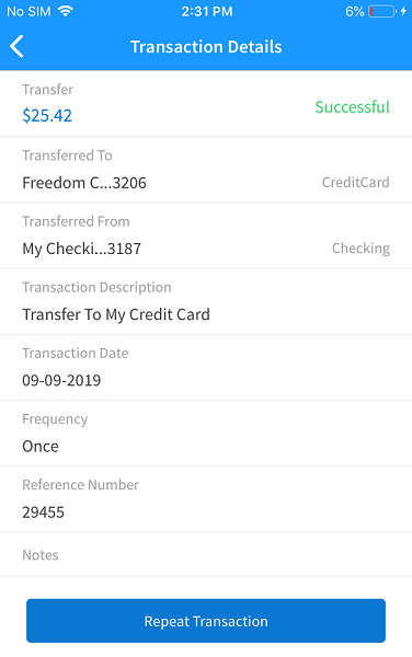 Click Repeat to recreate the same transaction. The app navigates to the Transfers screen.