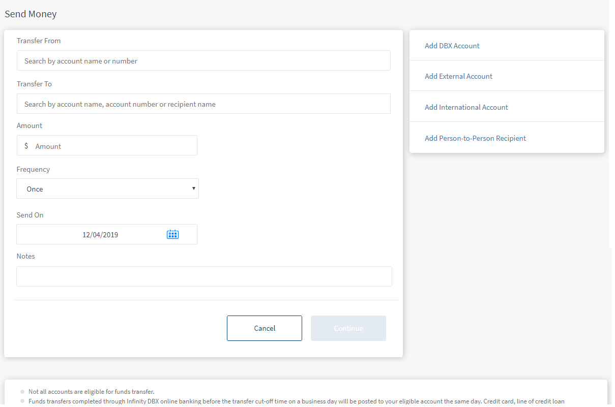 The Make Transfers feature can be used to transfer funds between accounts on the Transfer Money screen. You can initiate a new fund transfer to your ownaccount in the same bank, recipients in the same bank, recipients in other banks that you have added, recipients in international banks, to P2P recipients, and wire transfers.