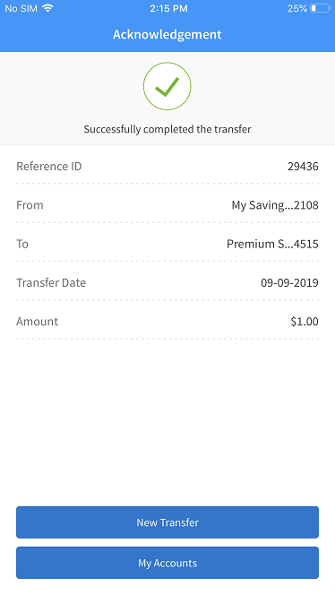 The app displays the acknowledgment screen with transaction details, unique reference number to the transaction, and provision to do the following: