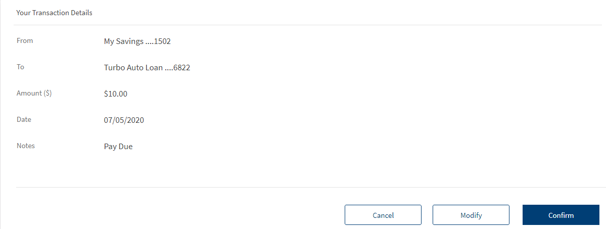 - When the transfer to a loan is initiated, the next due amount is pre-filled in the "Amount" field. You cannot modify the due amount.