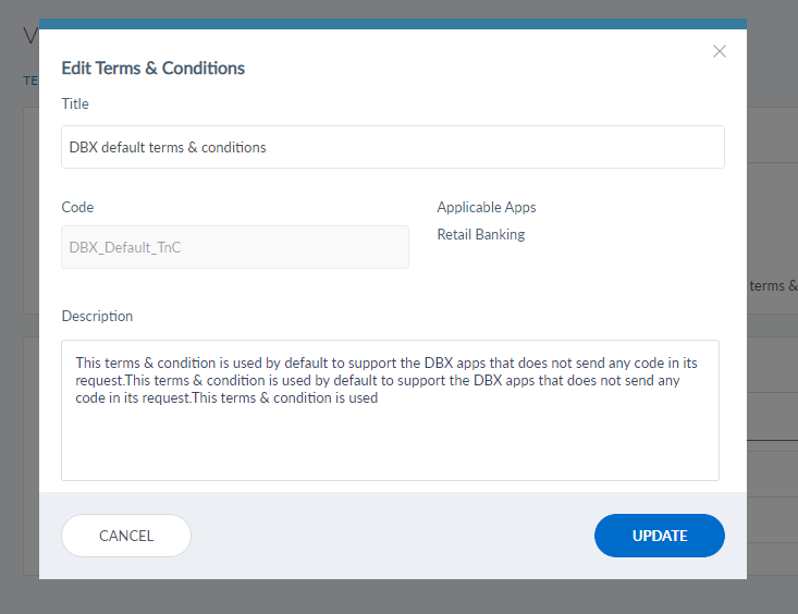 Select a T&C from the list to make modifications. The following page shown below contains details of the selected T&C which is broadly divided into two sections. The top section contains the tile, its associated code and application(s), and description. You can edit only the title and description of the T&C.