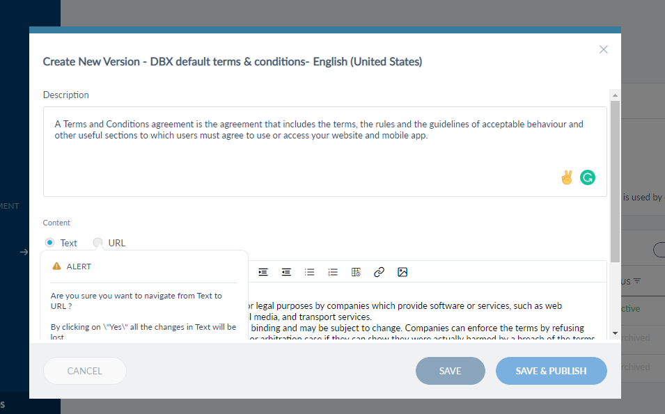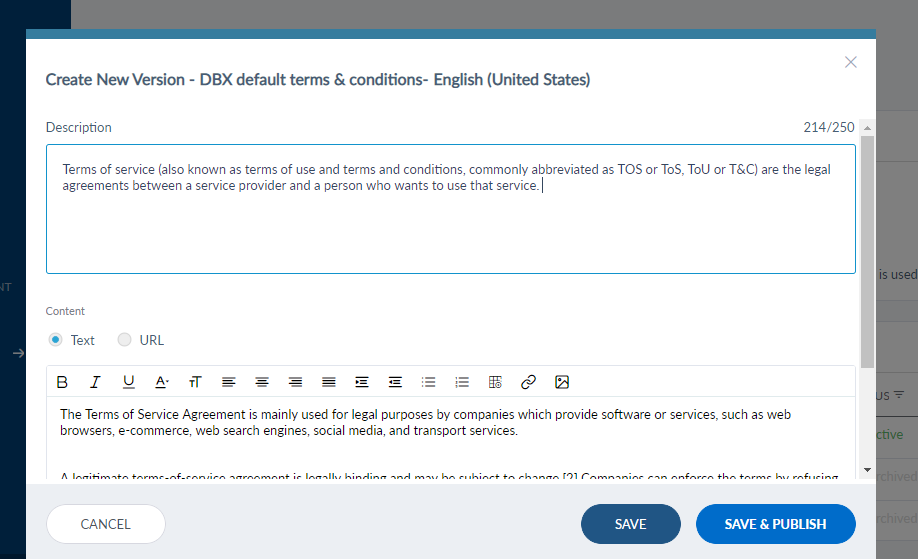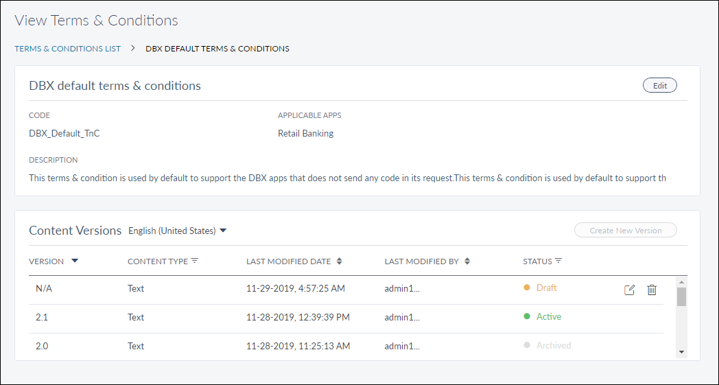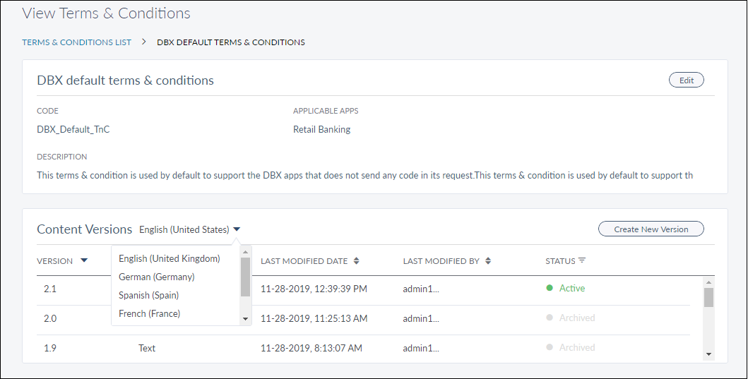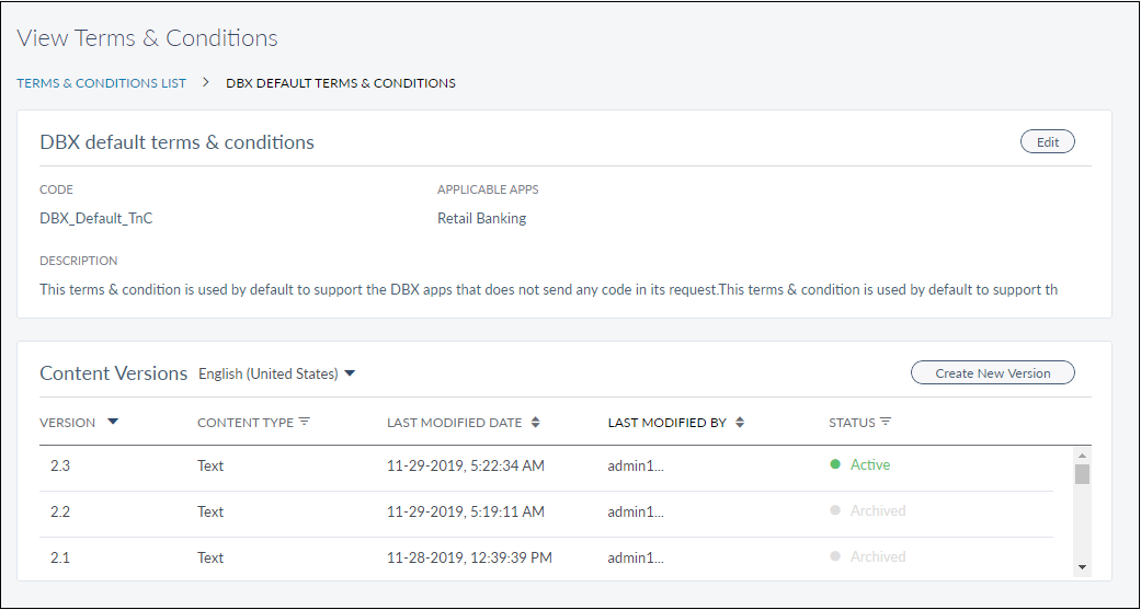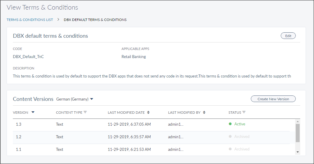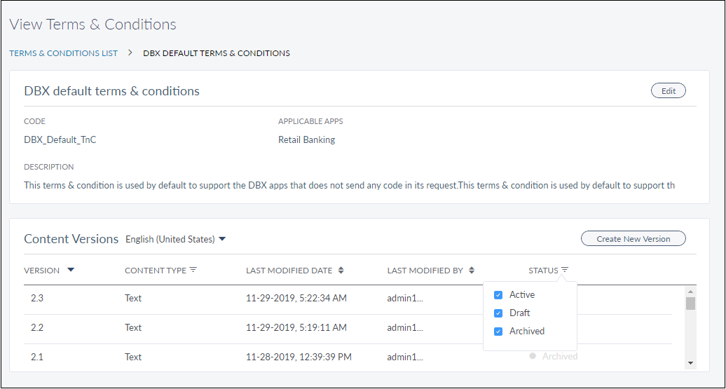 You can view the current and the archived versions of the T&C by selecting it. No actions are possible on a T&C which is in the Active or Archived states. Select the Create New Version tab to create a new version of the selected T&C. Provide the details for these fields: