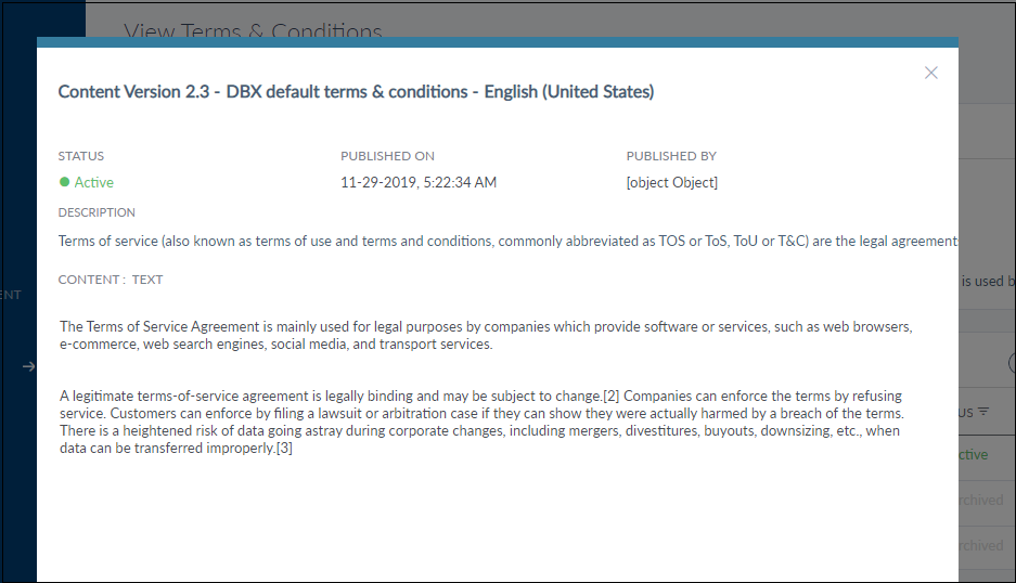 After you publish the T&C, the status is changed to Active with a new version number. Select the T&C from the list to view it.