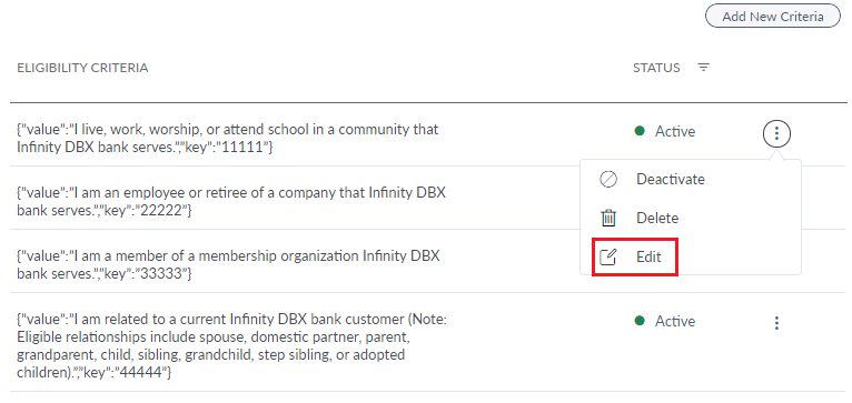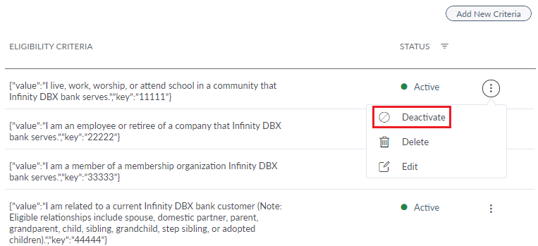 available on each row and update the status based on the current status of the criteria. The following statuses are available: Activate, Deactivate. For example, if the current status Active, you can deactivate the criteria. Only active criteria will be displayed during the onboarding process in the customer-facing application.